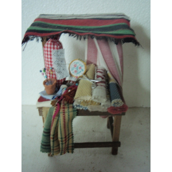 Puesto de madera para figura de 21 cms con accesorios de telas